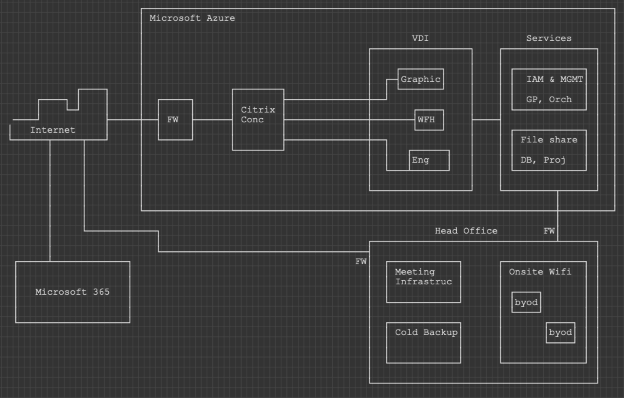 Pretty cool huh. It works like this: a user can be at home and log in through the citrix concentrator with their Azure AD creds. When they do their desktop gets spun up in the virtual desktop infrastructure pool (VDI). From there they have access to the file share, databases, and the programs they need to complete work for the business. The head office also has an internet connection so they can use the Citrix entry to the VDI and Microsoft 365. Because the organisation has elected for a BYOD approach they give employees an allowance toward buying a personal device for use in the work environment. When they connect to the VDI the concentrator does some light health checking of the BYOD device, but doesn’t look for full security compliance. There is also an IPsec tunnel into the back end of the Azure environment which allows AD to be used for the wifi authentication, and allows local admins to administer the system. There are also cold backups of Azure images in the head office which transfer monthly from the hot backups kept in Azure. Lastly there’s a small amount of meeting infrastructure (such as Teams tablets and video conferencing gear) which is networked through the head office.